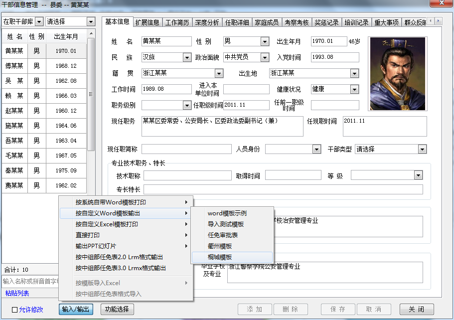5,在干部信息库中,点击输出按钮,可以选择按指定的模板输出单个干部