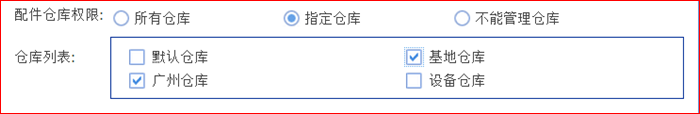 4)、配件仓库权限:如果选择所有仓库,则该用户管理管理所有仓库;如果选择指定仓库,用户可指定管理哪些仓库,没有指定选择的仓库查看不到该仓库货品情况;